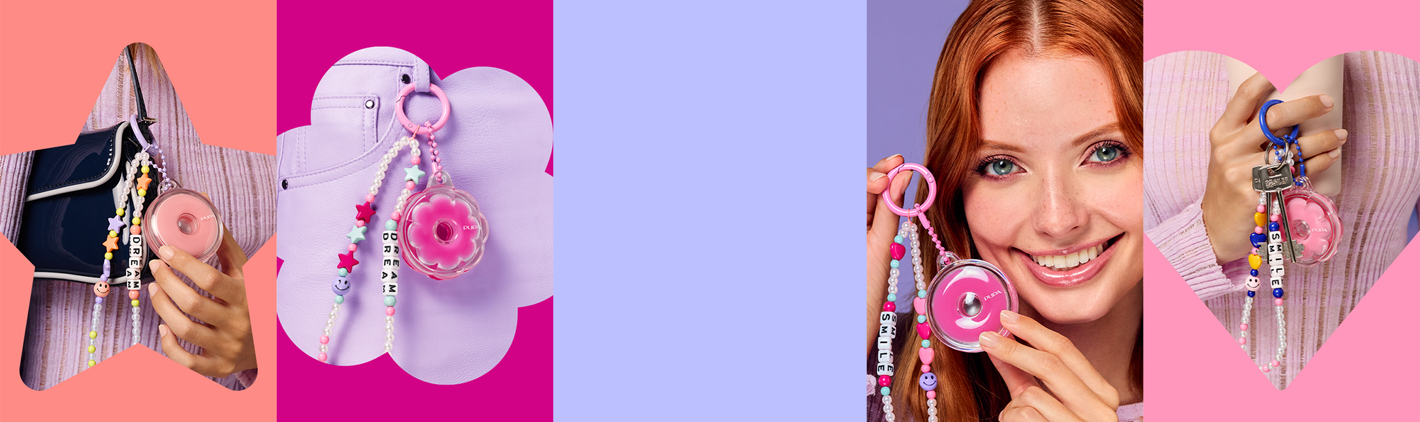 Ajoutez une touche de gaieté à votre look, accrochez les Happy Charms où vous voulez : sacs, pantalons, lunettes... ne soyez jamais à court de gloss !
